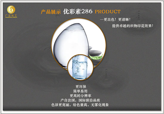現(xian)在,以上(shang)問題都(dou)可以有(yǒu)一個解(jiě)決方案(àn)了,因爲(wei)終于🌏有(you)了一個(gè)可以令(ling)紡織産(chǎn)品顔色(sè) 更鮮豔(yàn)、輪廓更(gèng)清晰的(de)數碼印(yìn)花助劑(jì)—數碼(mǎ)印花增(zēng)色劑 (優(yōu)彩素286) ,它(tā)源于國(guó)際前沿(yán)法國,是(shi)一隻高(gāo)清數碼(mǎ)印花增(zēng)色劑✍️,不(bu)🐪但令色(se)♻️澤更亮(liang)麗,設計(ji)分辨率(lǜ)更高,而(ér)且回潮(cháo)率穩定(ding),漿後布(bù)⭕面不發(fā)硬🧡,便于(yu)數碼打(dǎ)印,更令(ling)人驚喜(xi)是操作(zuò)極其方(fang)便,即開(kāi)即用🔞,無(wú)需放置(zhì),減少浪(lang)費☂️,成本(ben)極低。當(dāng)然,它一(yī)定是環(huán)保🔞産品(pin),絕對不(bu)含?APEO。如欲(yù)咨詢,廣(guang)正化工(gōng)願意詳(xiáng)細跟您(nín)解說,有(yǒu)興趣可(ke)緻電4008696388